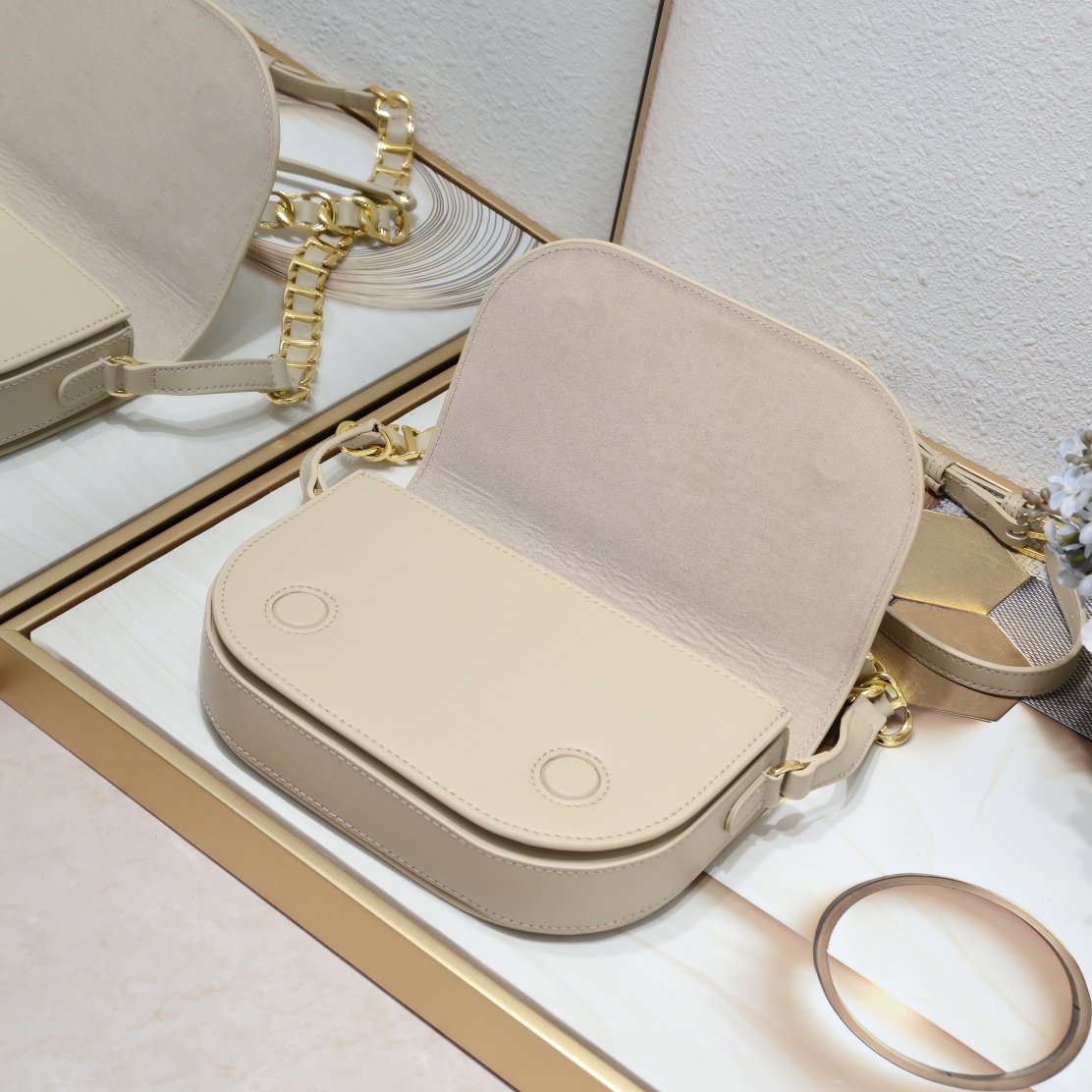 The latest Signature series combines modern style and elegant charm. It is carefully crafted from black cowhide leather. The front is decorated with a unique large logo embossed mark. It is matched with a chain shoulder strap made of intertwined letter logo chain links and leather, full of high-end feeling. Size: 21*6*12cm.