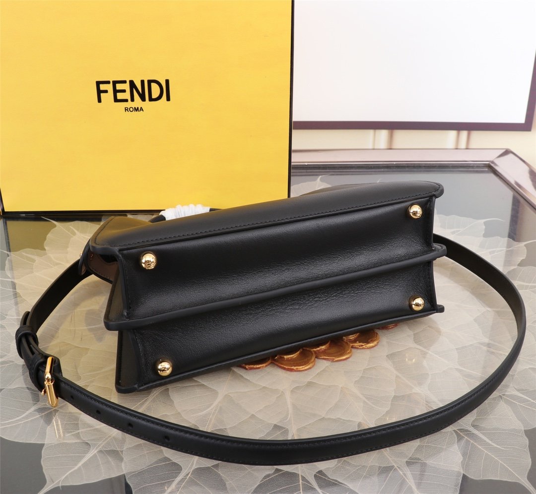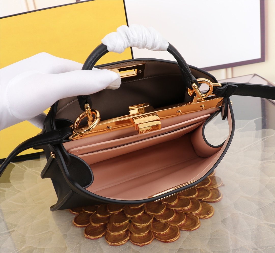 AAAAA grade, top quality. Fendi. Iconic Peekaboo ISeeU small handbag in black leather with classic twist locks on the sides. Pink and brown soft nappa leather lining with two compartments separated by hard baffles with buckle-down interior pockets and gold metal pieces. Handbag with handle and adjustable, removable shoulder strap for hand, shoulder or crossbody.